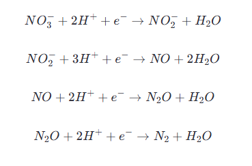 反硝化作用是由異養型細菌在缺氧或厭氧條件下完成的,它們使用硝酸鹽或亞硝酸鹽作為電子受體,將它們還原為氮氣,同時將有機物作為電子供體: