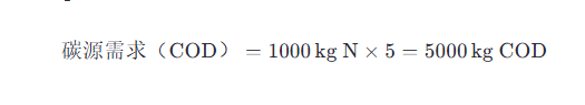 假設(shè)一個污水處理系統(tǒng)需要去除1000kg的總氮(以硝酸鹽氮計(jì)),并且采用的C/N比為5:1,則需要的碳源(以COD計(jì))為: